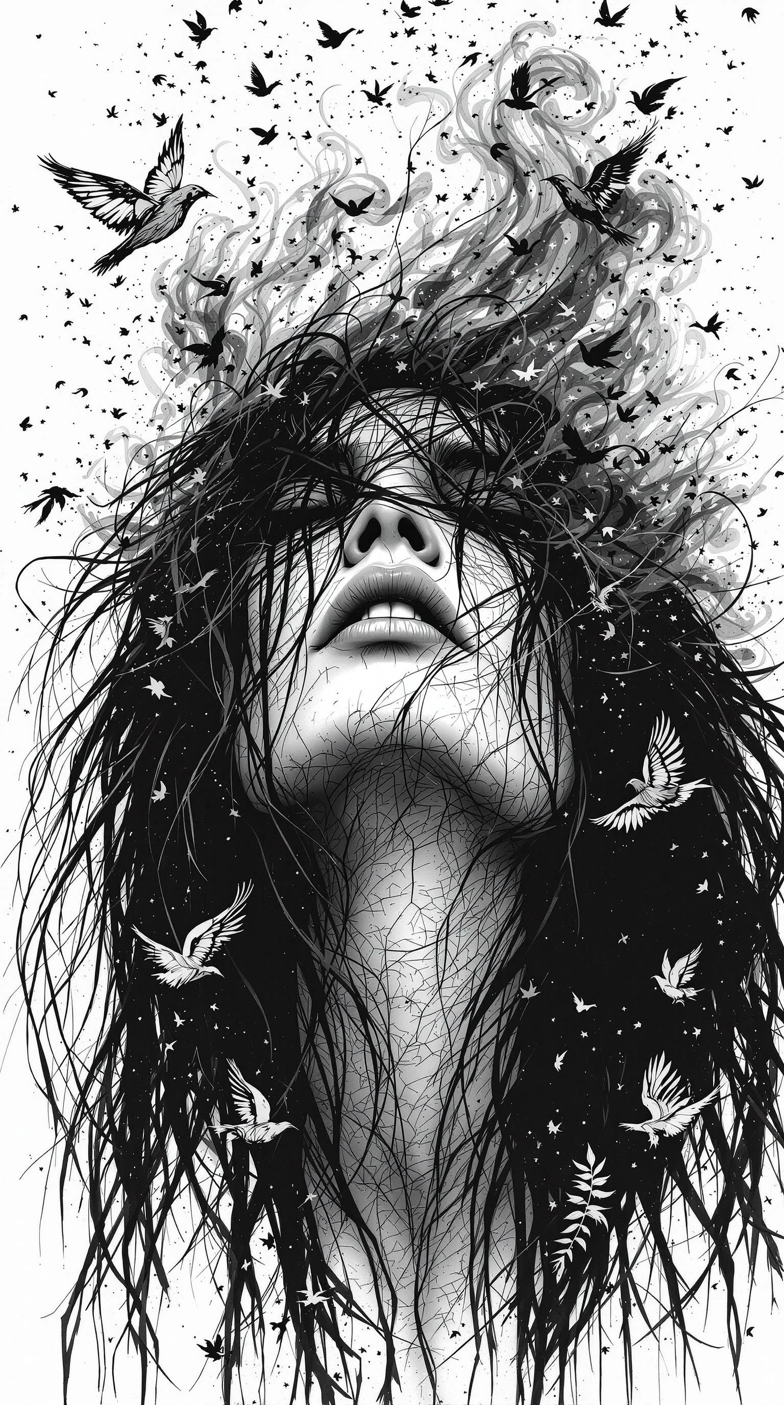 A breathtaking depiction of a woman with long, flowing hair that spills unevenly across her face, her expression filled with pained emotion yet radiating an undeniable allure. Subtle surreal details enhance the scene: her skin is marked with intricate, vein-like cracks, and her hair dissolves into a smoky void that twists into faint, dreamlike forms of birds and leaves. The artwork is rendered in a realistic style, with a bold, messy black ink effect that contrasts vividly against a pure white background. The composition is both haunting and mesmerizing, blending realism with surrealism to create a deeply emotive and visually captivating masterpiece.
