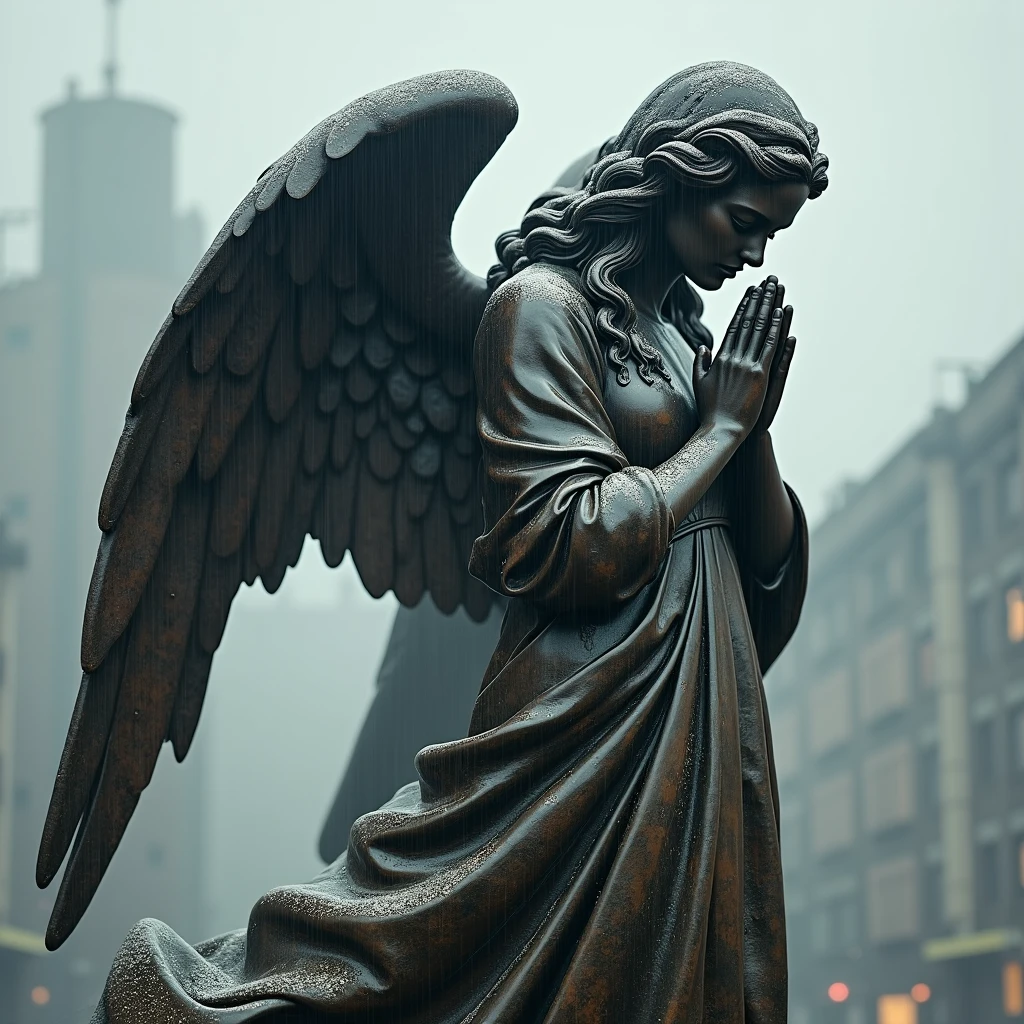 An ultra-high-resolution, surreal masterpiece of an angel beuty sculpted in molten iron, seamlessly merging divine elegance with abstract artistry. The angel is portrayed with its head bowed and hands clasped in prayer, as if carved from streams of black rusty metal, with every curve and fold of its flowing robes meticulously detailed to capture the illusion of movement. ;;brutalism style::rusty::natural tones :: by Lee Jeffries, Alessio Albi, Adrian Kuipers ::made with yashica mat124g :: 80mm 3.5::ilford 1600 grains and dirts::: rainy, natural tones :: by Lee Jeffries, Alessio Albi, Adrian Kuipers ::made with yashica mat124g :: 80mm 3.5::ilford 1600 grains and dirts::" grains and dirts:: snowing “Surreal dystopian brutalist architecture, massive concrete city:: hugh abandoned buildings with cracks and weathered stains, She is perched precariously on a tower, within a vast, concrete brutalism city, with a wide field of view. The high-angle shot emphasizes the city around her, :: birds :: birds