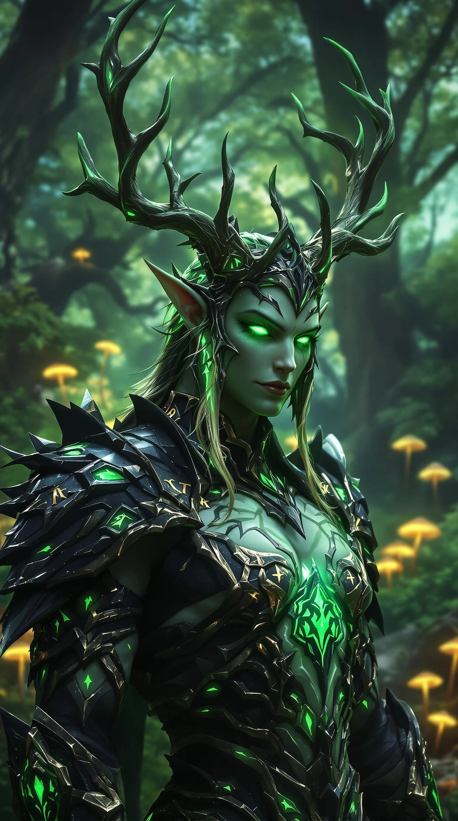 A realistic and cool portrayal of a World of Warcraft-inspired character, a Night Elf Druid in mid-transformation. The character’s features are a blend of human and animalistic traits, with glowing green eyes and antlers sprouting from their head. Their armor is intricately designed, with leaf-like patterns and glowing runes that pulse with nature’s energy. The black-and-white palette is accented with subtle green and gold hues, highlighting the magical elements of their appearance. The background is a lush, enchanted forest, with glowing mushrooms, towering trees, and a mystical atmosphere. Rendered in ultra-high resolution with cinematic lighting, this image brings the fantasy of WOW to life.
