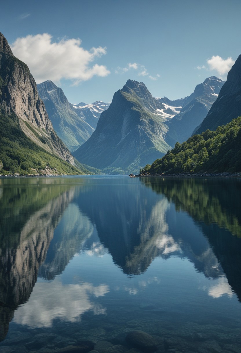 masterpiece, photorealistic, scandinavia, fjords, water, mountains, blue sky, serene, peaceful, uninhabited