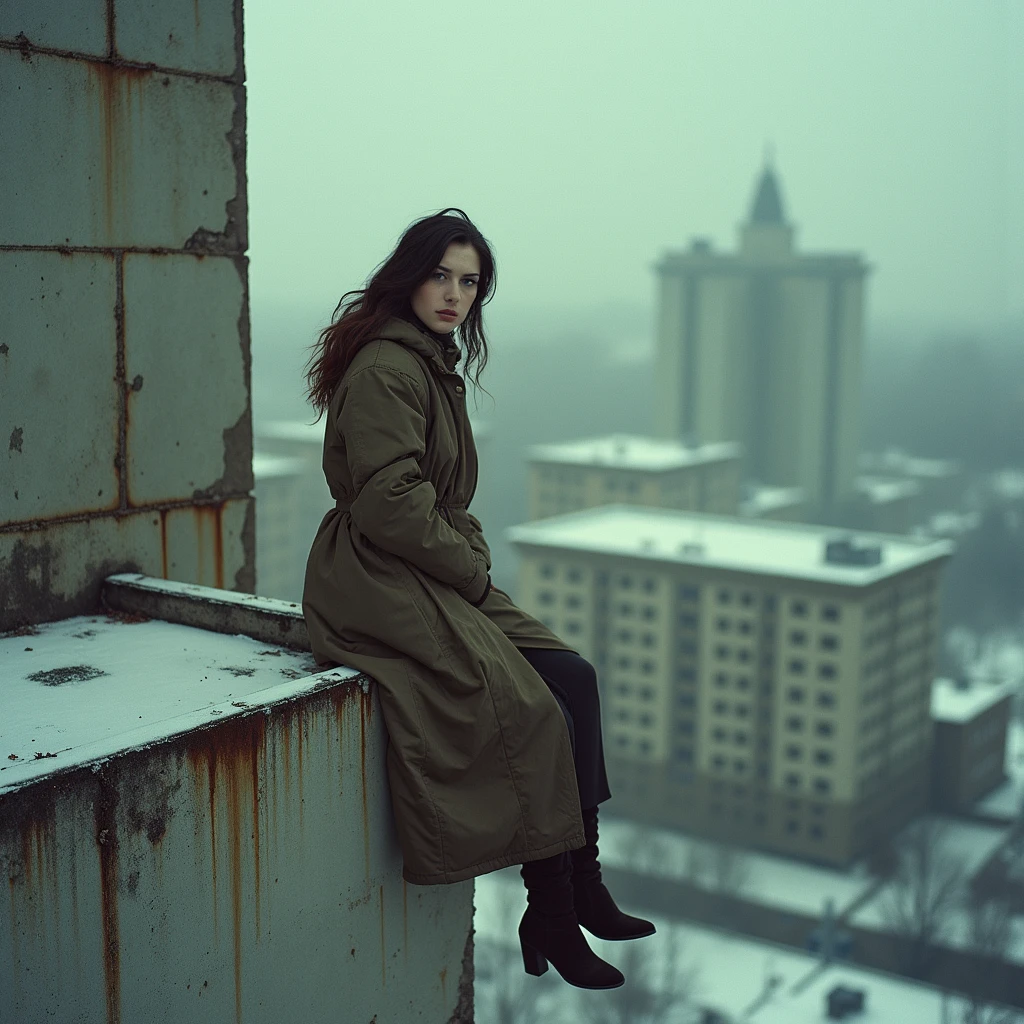 A high-angle, full-body analog film photograph of Portrait :: young sweet sad Beauty charming woman ;; the concrete ::brutalism style::dystopian cyborg city ::winter :: siberia ::Vintage car ::rusty::natural tones :: by Lee Jeffries, Alessio Albi, Adrian Kuipers ::made with yashica mat124g :: 80mm 3.5::ilford 1600 grains and dirts::: rainy, natural tones :: by Lee Jeffries, Alessio Albi, Adrian Kuipers ::made with yashica mat124g :: 80mm 3.5::ilford 1600 grains and dirts::" grains and dirts:: snowing “Surreal dystopian brutalist architecture, massive concrete city:: hugh abandoned buildings with cracks and weathered stains, She is perched precariously on a tower, within a vast, concrete brutalism city, with a wide field of view. The high-angle shot emphasizes the city around her, and her small, fragile nature.