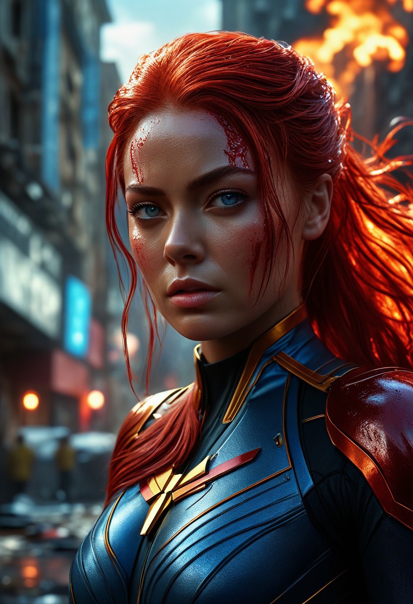 UltUltra detailed digital art masterpiece, Hyperdetailed, hyperrealism, extremely high resolution of Beautiful Superheroine Jean Grey as Dark Phoenix, Greg Rutkowski style, stands in a bloody, sinister fiery battle in the streets of a ruined city, Realistic blue eyes, wavy red hair, Intricately designed cool X-Men Superheroine combat costume with X logo, Marvel, X-Men, 8K, deep color, Cinematic Lighting, intricate smooth, sharp focus digital painting, Artgerm, WLOP, Greg Rutkowski, Beautiful Sadie Sink as 21 years old Jean Grey as Phoenix, Intricately Designed handsome pale face, Marvel comics, Realistic combat dirty clothing, perfect whole athletic body, defiant and seductive, Photograph Taken on Nikon D750, Intricate Elegant, Digital Illustration, Scenic, Unreal Engine, CryEngine, Octane Render, 8k, Designed combat clothes, Attractive, Attractive black woman, dramatic lighting, wet and sweaty skin, beautiful firm Breasts, Daylight, Concept art by Greg Rutkowski, adding to the intense and dynamic atmosphere of the scene
