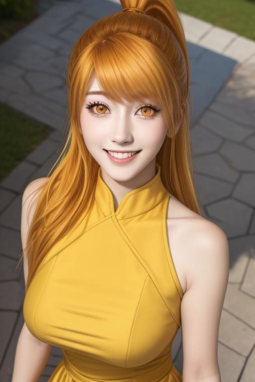 ((masterpiece, best quality)), 1girl, xiaoninger, solo, long hair, orange hair, orange eyes, ponytail, bangs, outdoors, large breasts, smile, xianxia dress, from above, smile, natural color skin