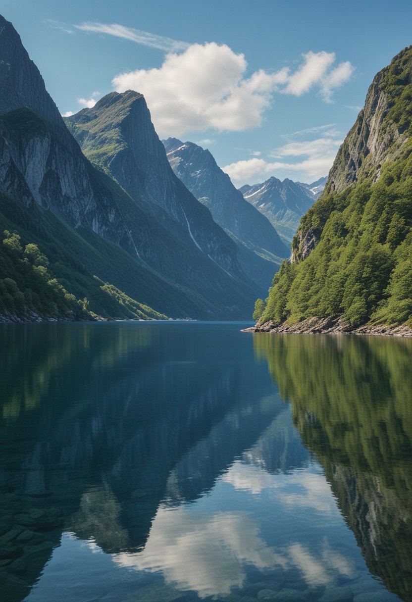 masterpiece, photorealistic, scandinavia, fjords, water, mountains, blue sky, serene, peaceful, uninhabited