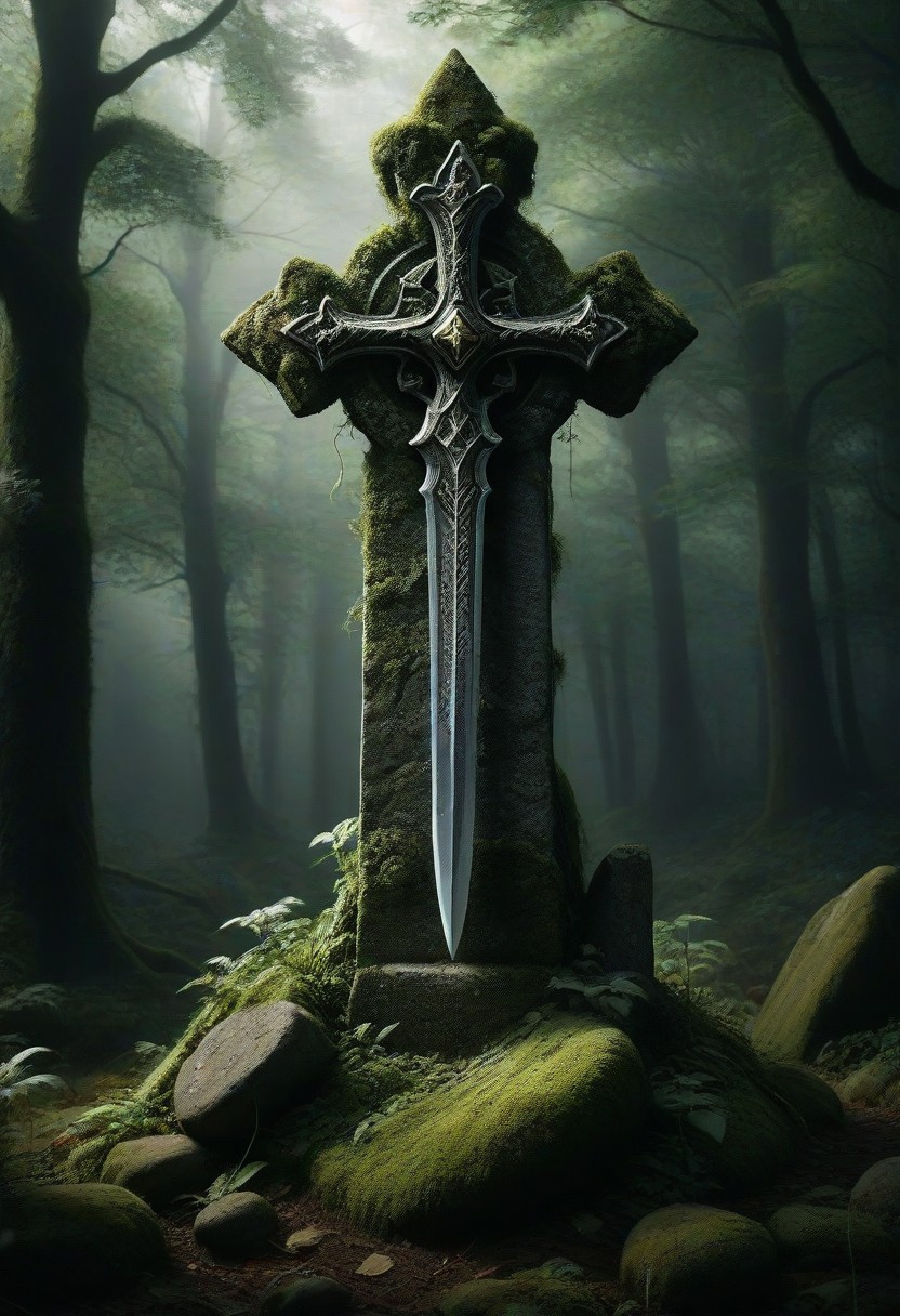 A detailed image of an enchanted medieval fantasy sword thrust into a large, clean boulder that serves as a gravestone. The sword is vertical, resembling a cross, with the blade driven in slightly more than halfway. The sword appears ancient, with a slightly glowing blade and intricate details on the hilt. The boulder is clean and solid, not covered in moss, and the grave is relatively new. The scene is somber and mystical, set in a quiet, slightly overgrown graveyard.