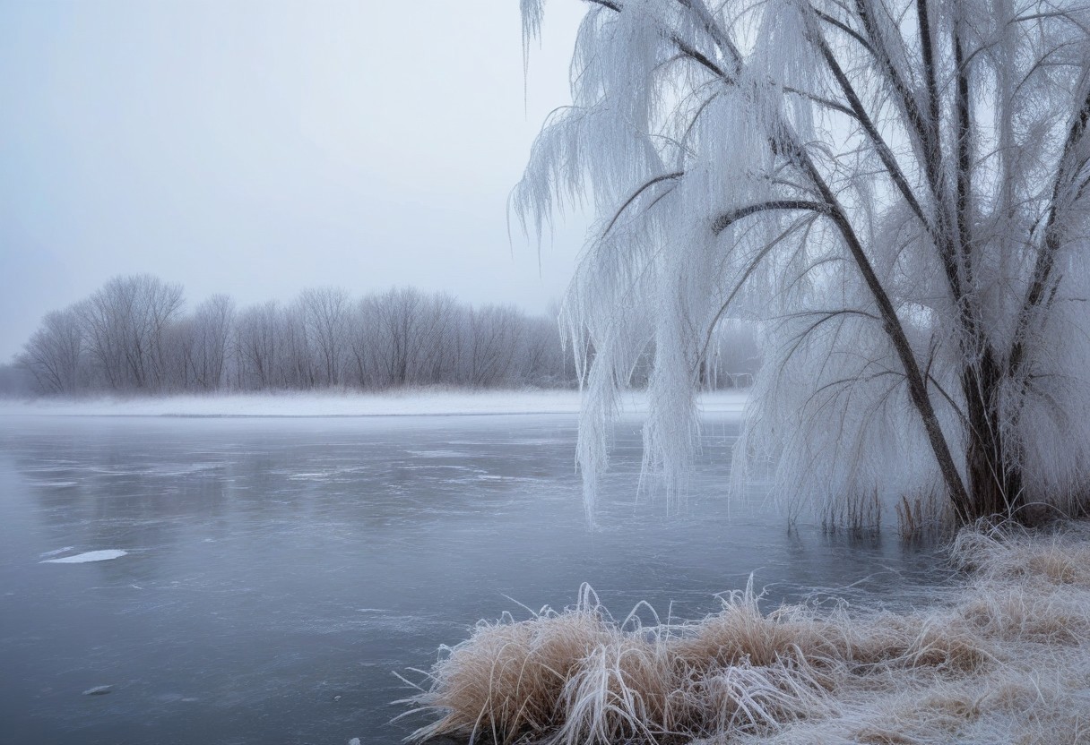 Tree with frost on the branches at the edge of a river which has frozen at the edge of it, frozen cattails at the edge of the river, back blowing snow and drizzle of cold morning on a lake, warning of extreme cold