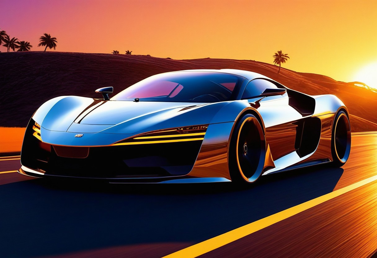 Centered, Incredibly Detailed Accurate Picture Of A sleek, metallic sports car, low to the ground with curved lines and vibrant headlights, in a dramatic, cinematic pose, illuminated by a warm, golden sunset glow, with a shallow depth of field, in the style of Syd Mead's futuristic concept art, infused with the vibrant colors of Ash Thorp's digital paintings, and the detailed textures of Ian McQue's industrial design illustrations.