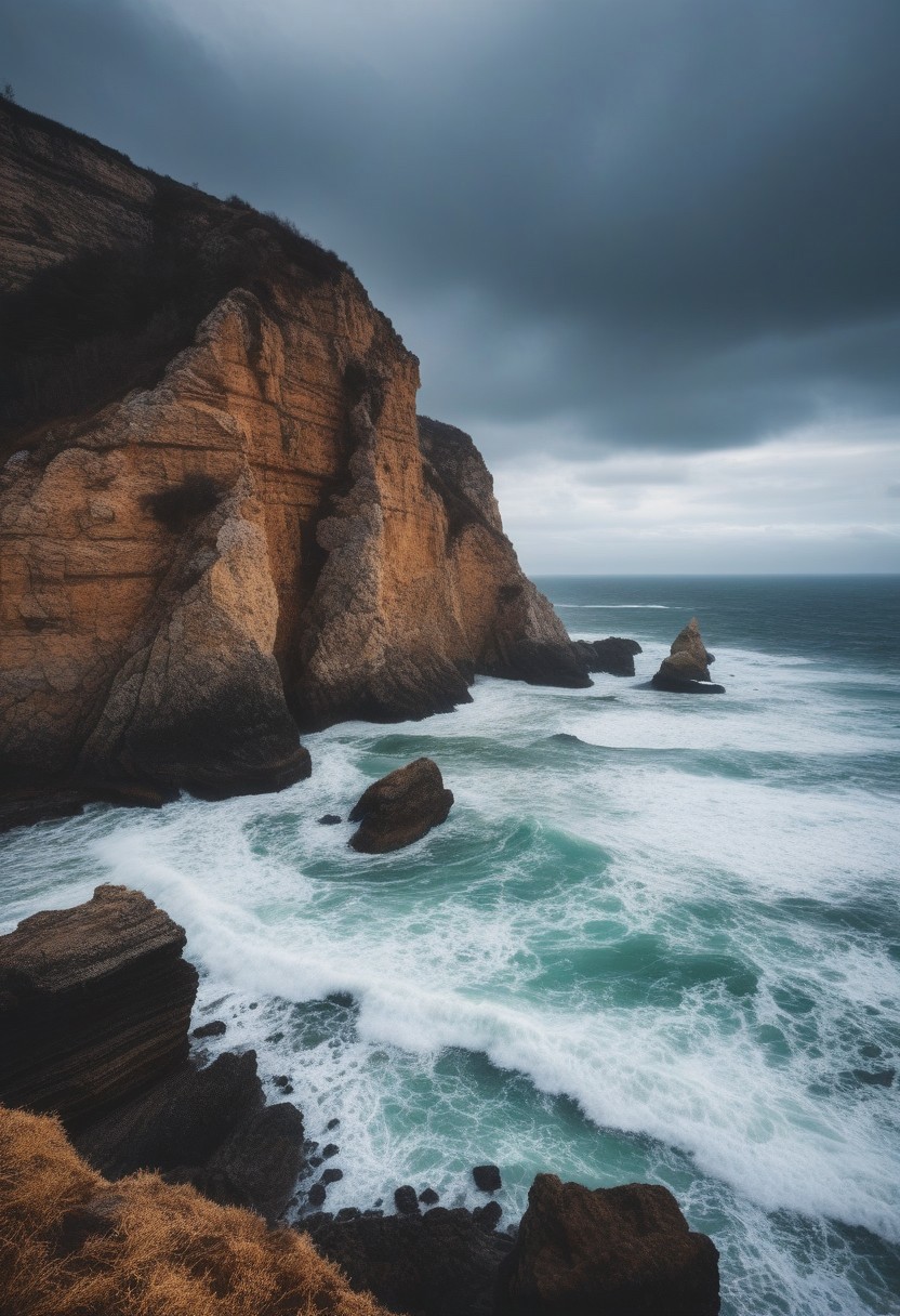extremely detailed photo of a perfect coastline, cliffs and rocks, waves, cloudy weather