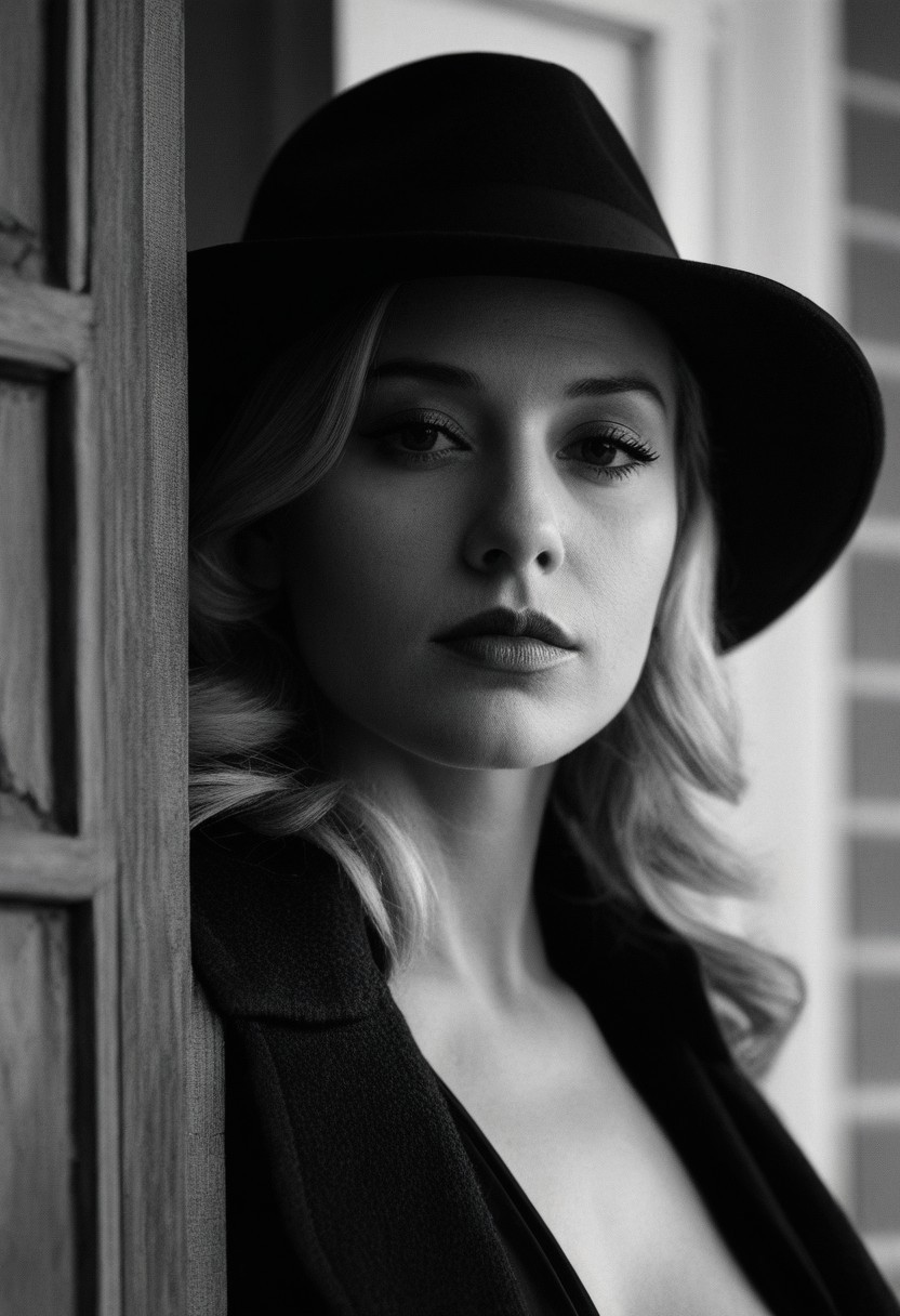 (stern look), (monochrome), (portrait), (closeup), cinematic film, shadow, partially covered in shadow, 28 year old blonde french woman standing door of old house, fedora, wicked, femme fatale, lips, eyelashes, profile, realistic, shallow depth of field, vignette, highly detailed, high budget, bokeh, cinemascope, moody, epic, gorgeous, film grain, grainy, burlesque, (natural skin),