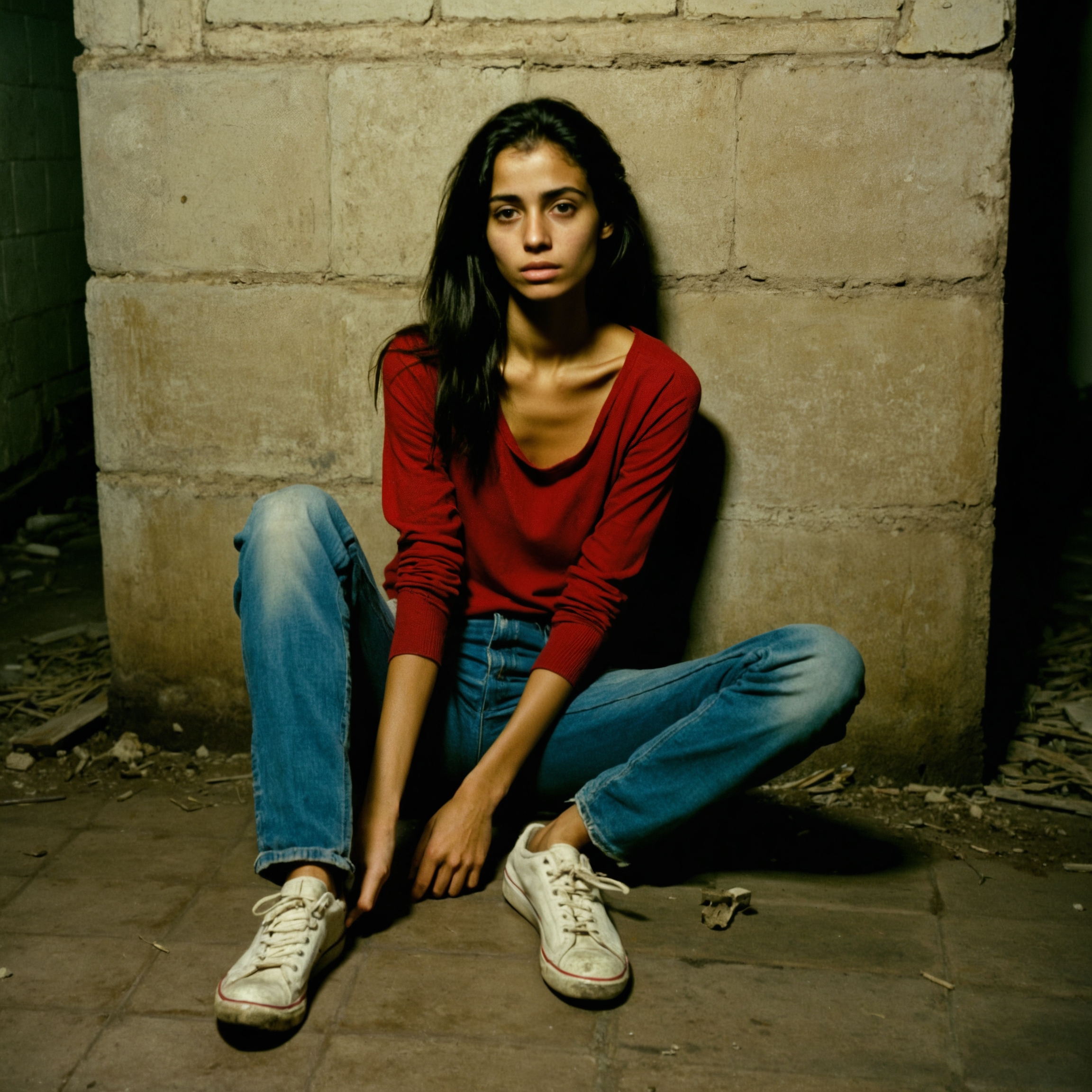 RAW full body analogue photo of a beautiful 20 years old woman, ,__Random_Woman__,well-shot, grainy, amateurish photo of an skinny, busty woman sitting on an old basement floor and looking up. She an elegant, slim face, She is wearing a worm, dirty, red shirt and worn, ripped jeans. She is unwashed, very dirty and grimy. She looks unhappily at the camera pleading. The spooky basement is dimly lit and very dirty. eerie, interesting, natural, film grain. ,low light, soft natural light, Rembrandt style light, Hasselblad DLSR camera, 200mm Zeiss lens, f/2.8 ,Sexy pose, erotic pose, eshibitionism