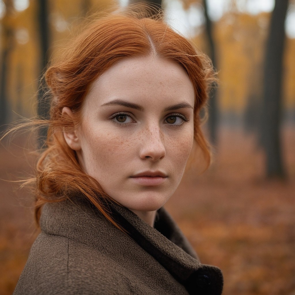 (windy), (closeup:4), (portrait:4), orange autum blossom in her hair, skin roughness, freckles:0.5, (warm friendly looks), (taking a walk), ((arched eyebrows)), striking face, ((prominent nose)), ,30 year old woman, auburn bun ,natural skin, looking away, full lips, brown eyes,, (soft warm light), forest, (((fog))), , autumn, (cinematic, film grain:1.1, bokeh)