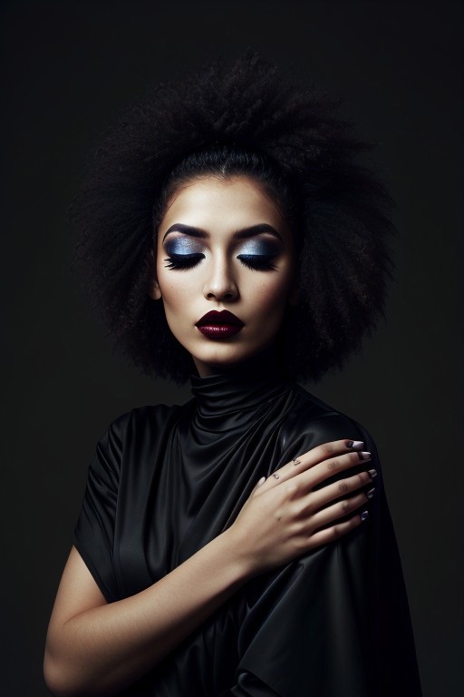The image is a high-resolution photograph of a person with an ethereal, surreal aesthetic. The subject is a woman with a striking, statuesque appearance, her face and body draped in a dark, almost black, high-fashion ensemble. She has her eyes closed, giving an impression of serenity or contemplation. Her makeup is dramatic, with dark, matte lipstick and eyeshadow that matches the dark tones of her attire.