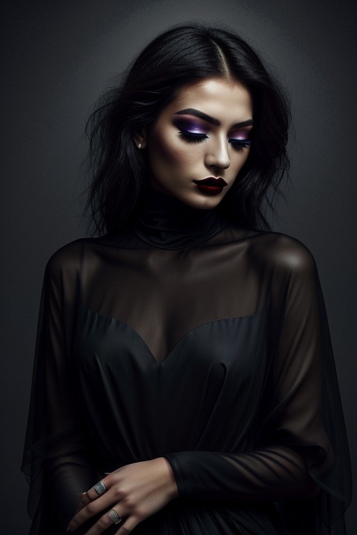 The image is a high-resolution photograph of a person with an ethereal, surreal aesthetic. The subject is a woman with a striking, statuesque appearance, her face and body draped in a dark, almost black, high-fashion ensemble. She has her eyes closed, giving an impression of serenity or contemplation. Her makeup is dramatic, with dark, matte lipstick and eyeshadow that matches the dark tones of her attire.