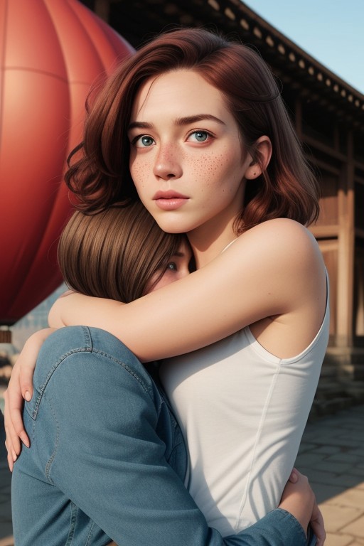 gingedenwom, cinematic photo, 1girl, the temples of bagan with hot air balloons at sunrise, affectionate, hugging, blushing cheeks, black graphic tee with ripped skinny jeans, close-up, 35mm photograph, film, professional, 4k, highly detailed