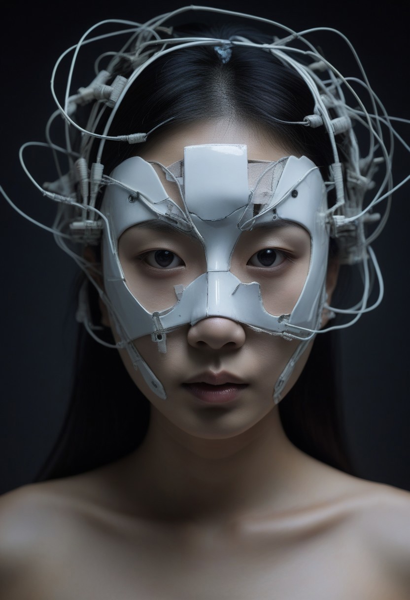 An Asian woman wears a fractured porcelain mask with exposed wires and technological elements underneath, captured as a haunting photograph using a close-up shot, under the dim, focused light of an interior space, emphasizing the blend of fragility and technology and the sense of concealed emotions.