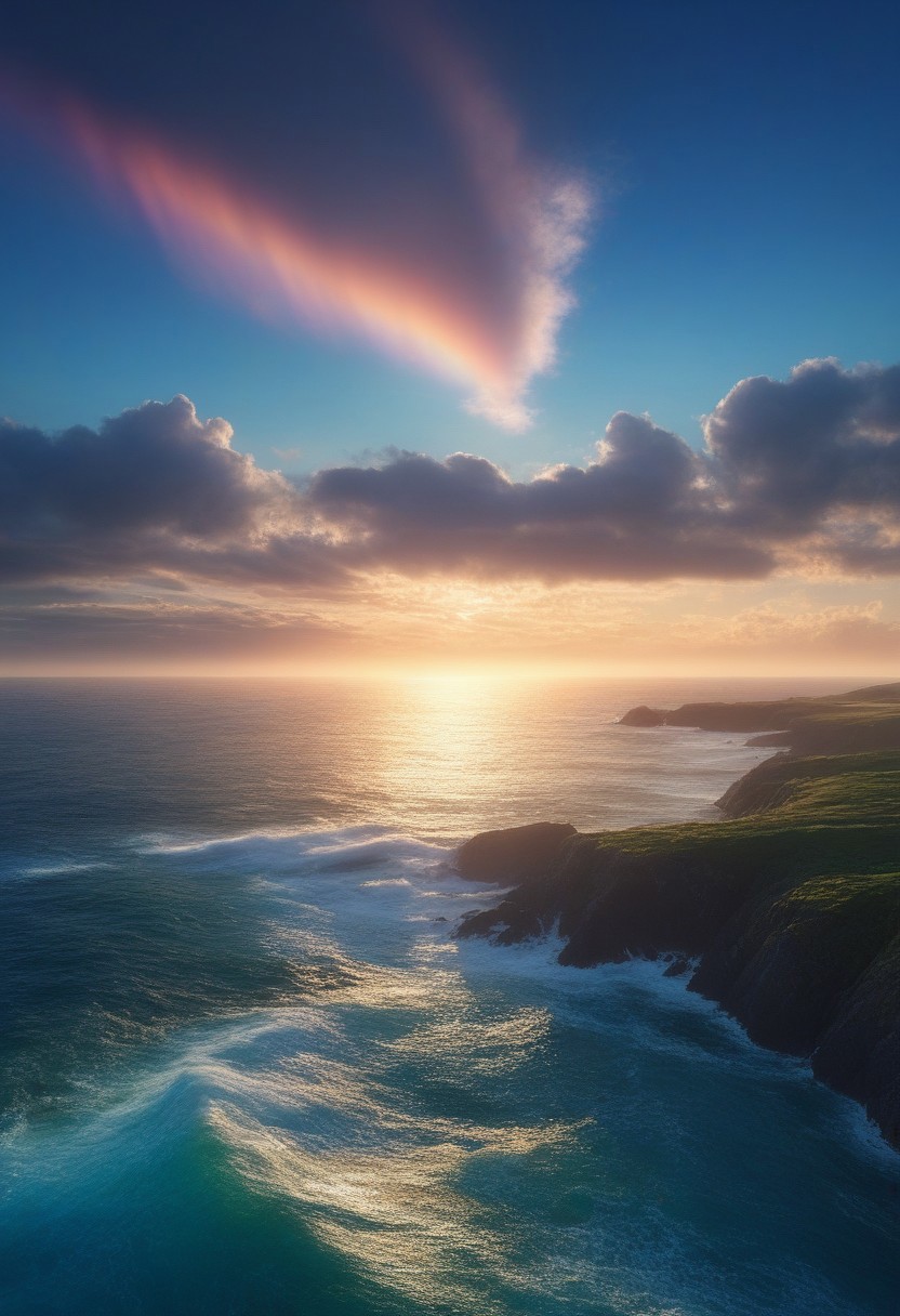 professional 3d model of ocean,lighthouse , an ethereal glowing ocean, with gentle waves, glowing creatures, tranquil ambiance, hidden beauty, a serene cloudscape, with fluffy white clouds, gentle winds, and a brilliant blue sky, offering a sense of peace and tranquility, aurora borealis atmospheric, Rainbow after rain Weather, twightlight , epic composition, cinematic,anime, <lora:add-detail-xl:0.3>, <lora:游戏概念场景(二次元方向):1> HEZI,, octane render, highly detailed, volumetric, dramatic lighting
