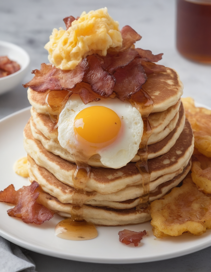 A classic American breakfast plate with fluffy scrambled eggs, crispy bacon, golden hash browns, and a stack of buttermilk pancakes drizzled with maple syrup, served on a white ceramic plate.