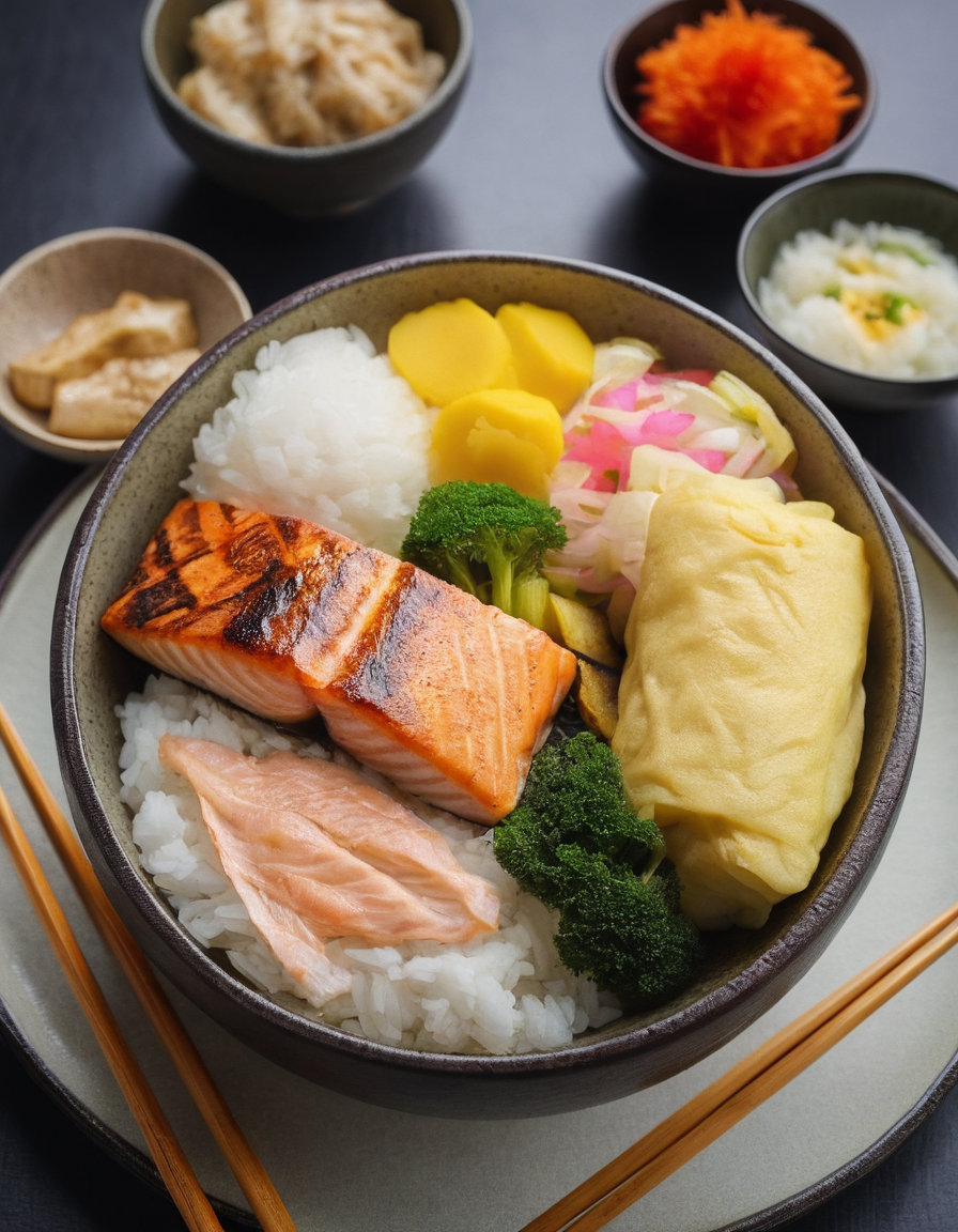 A single bowl of Japanese-style lunch with grilled salmon, steamed rice, tamagoyaki (rolled omelet), and pickled vegetables, food photography, food focus.