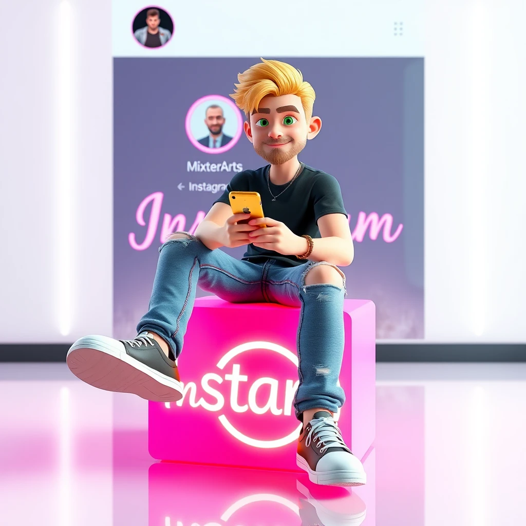 A 3D animated blond green-eyed male character sitting on a large pink block with the "Instagram logo in neon", the floor is so translucent mirror-like. He wears slightly destroyed jeans and a stylish t-shirt, with gold iPhone in hand. He has a thin beard. The background features a digital representation of an Instagram profile page with the name 'MixterArts' and a small circular profile photo of the character. The overall theme appears to be a fusion of digital and animated elements, possibly representing a virtual or digital Instagram avatar.
