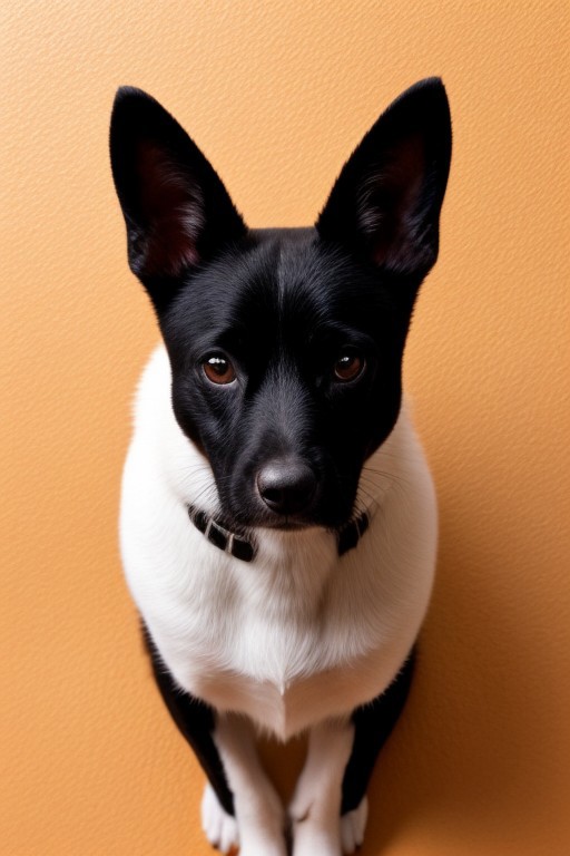 A close-up minimalist illustration of a black dog with striking yellow-orange eyes peeking from behind an orange wall. The artwork features smooth, clean lines and a subtle texture, emphasizing the cat's playful expression. The creamy beige background complements the orange accent, creating a harmonious and modern aesthetic.