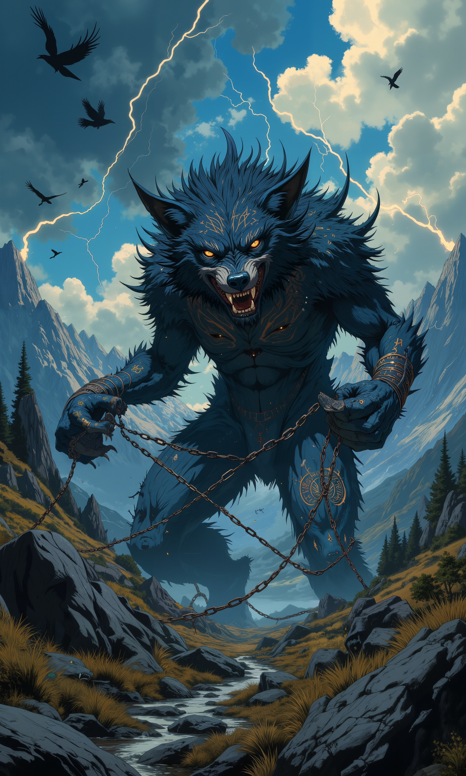 Hyperrealistic depiction of the legendary Fenrir wolf breaking free from his chains at the onset of Ragnarök. Colossal beast with matted fur, glowing amber eyes, and razor-sharp fangs. Shattered magical bindings, Gleipnir, float around him. Towering mountains and stormy skies in background. Yggdrasil world tree visible, shuddering. Odin's ravens circle ominously. Lightning strikes, illuminating scene. Ethereal aurora borealis despite daytime. Intricate Nordic runes glowing on Fenrir's fur. Scale emphasizes Fenrir's immense size. Masterpiece, 8K resolution, dynamic lighting, photorealistic details. <lora:NeonFantasyPrimeFLUX-000049:0.6> <lora:Comic book opus 3:0.4> <lora:flux_dev:1>