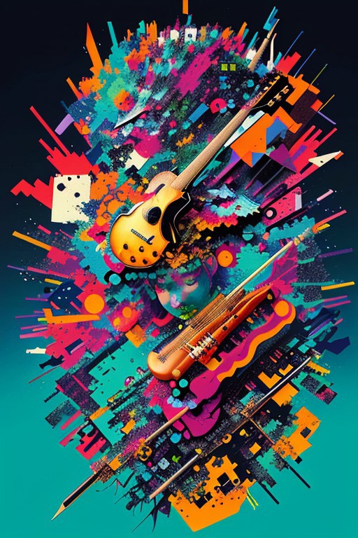 Create a striking abstract collage using vibrant cutout images of musical instruments. Blend them together in an unusual way with glitch effects. side view,