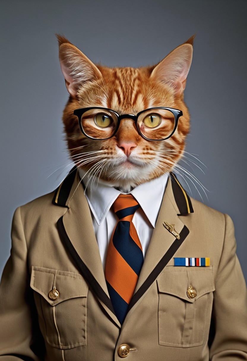 General Orange Feline in glasses, in strict US Military Dress Uniform, blazer and huge striped tie, buttoned up, Close-up portrait, color portrait, Linkedin profile picture, professional portrait photography by Martin Schoeller, by Mark Mann, by Steve McCurry, bokeh, studio lighting, canon lens, shot on dslr, 64 megapixels, sharp focus, Greens and Gold Tones