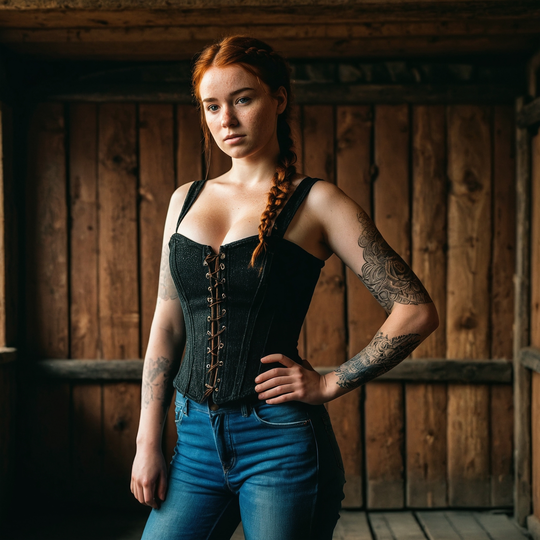 RAW full body analogue photo of a beautiful 20 years old woman, clear focus, 8K,__Random_Woman__,(background is a Rustic barn interior at dawn, dust particles dancing in golden light streaming through cracked window, worn wooden floorboards, vintage farming tools hanging on stone walls, woman in black lace corset and high-waisted jeans standing by antique plough, arms crossed, defiant expression, long French braid natural breasts, perky breasts, thicc, soft body, gopro photo of an 20 yo woman, ((shoulder tattoos, sleeve tattoos)), blushing, shadow, hard light, dark background, vibrant tones, clean lines, minimalistic, artistic, abstract forms, modern design, dynamic angles, textured surfaces, contrasting hues, 50mm lens, f/8, eye-catching patterns, striking, crisp edges, imaginative ,photo Fantasy art combining the styles of Boris Vellejo and Luis Royo,Photorealistic, real photo, god rays, 1girl, 21yo,realistic, ,Sexy pose, erotic pose, exhibitionism ,Enchanted grove