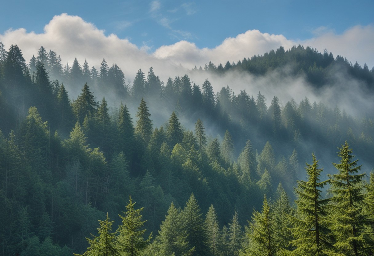 masterpiece, photorealistic, pacific northwest, rainforest, misty, hills, dense trees, blue sky, wispy clouds, serene, peaceful, uninhabited