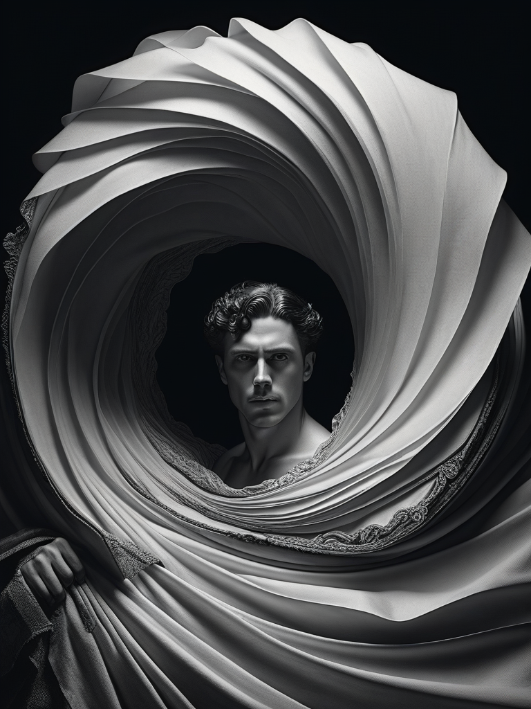 <lora:04Vintageillustration_Hap_XL:3.3>,Norman Rockwell style,vintage poster, A person with fabric like waves coming off them with lots of depth and contrast to them, a persons face and front body, black and white still, digital Art, perfect composition, beautiful detailed intricate insanely detailed octane render trending on artstation, 8 k artistic photography, photorealistic concept art, soft natural volumetric cinematic perfect light, chiaroscuro, award - winning photograph, masterpiece, oil on canvas, raphael, caravaggio, greg rutkowski, beeple, beksinski, giger,