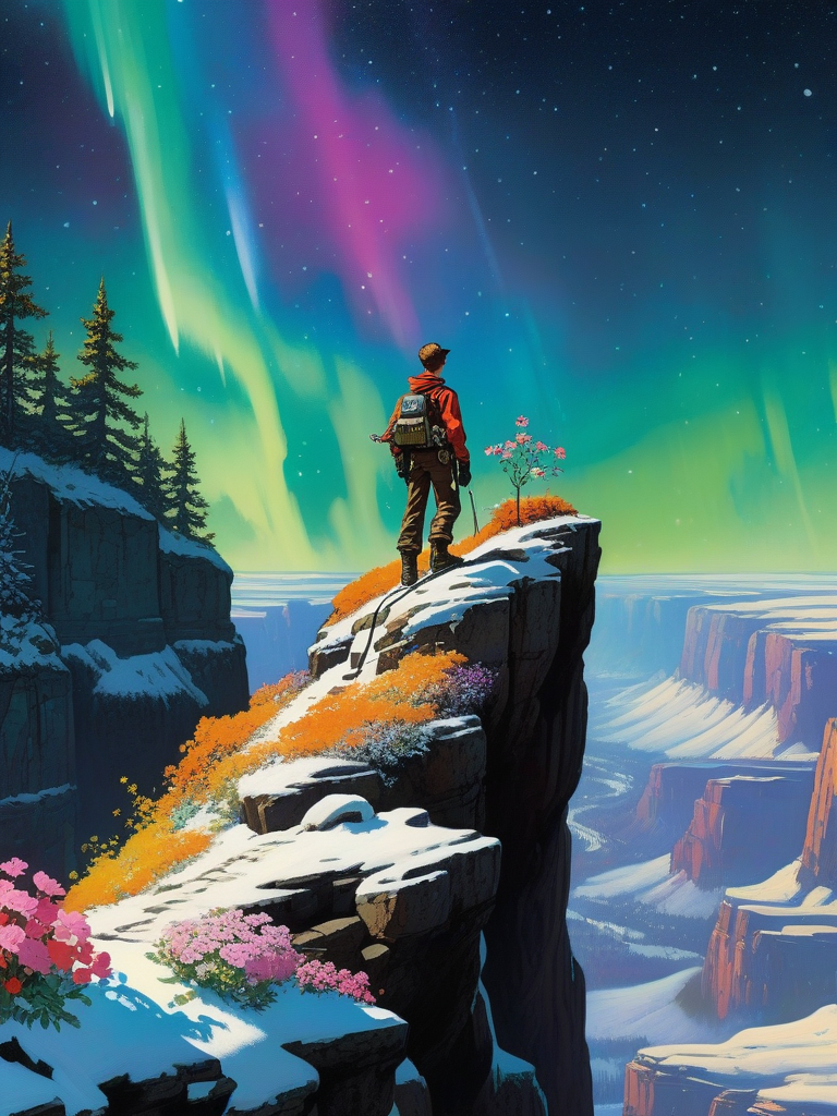 <lora:04Vintageillustration_Hap_XL:3.3>,Norman Rockwell style,vintage poster, an image of a person standing on top of a snowy cliff, looking down on a magical garden at the bottom of the cliff with many bright and colourful flowers, night sky with sparkling aurora borealis, from kingdom hearts, very very beautiful fantasy art, , neon ambiance, abstract black oil, gear mecha, detailed acrylic, grunge, intricate complexity, rendered in unreal engine, photorealistic,