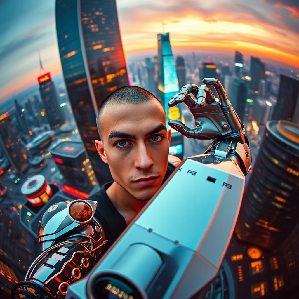 The high-angle photo captures the Russian supermodel's imposing presence in a futuristic cityscape at dusk, taking a selfie. His cybernetic-style right arm, with shiny metallic hands grasping the air, perfectly integrating human and machine. Piercing green eyes scan the horizon as the neon lights of towering skyscrapers illuminate his confident pose. The GoPro camera captures every detail of the hyper-realistic scene.