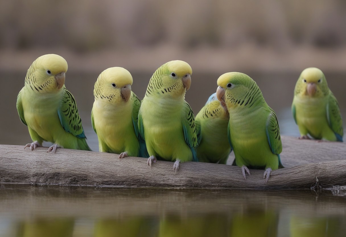 close-up several parakeets on the edge of a lake drinking and bathing, background Australian bushes and meadows, very realistic photography