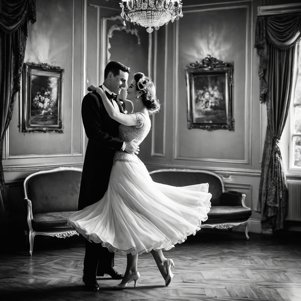 1male, 1female, Graceful couple in stunning vintage outfits, dancing elegantly with poise, retro black and white theme, capturing timeless elegance, focus on the couple as they move gracefully together, with a collection of cherished couple photos displayed in the background, viewed from a bird's-eye perspective, adding depth and a unique angle, enhancing the nostalgic and romantic ambiance.