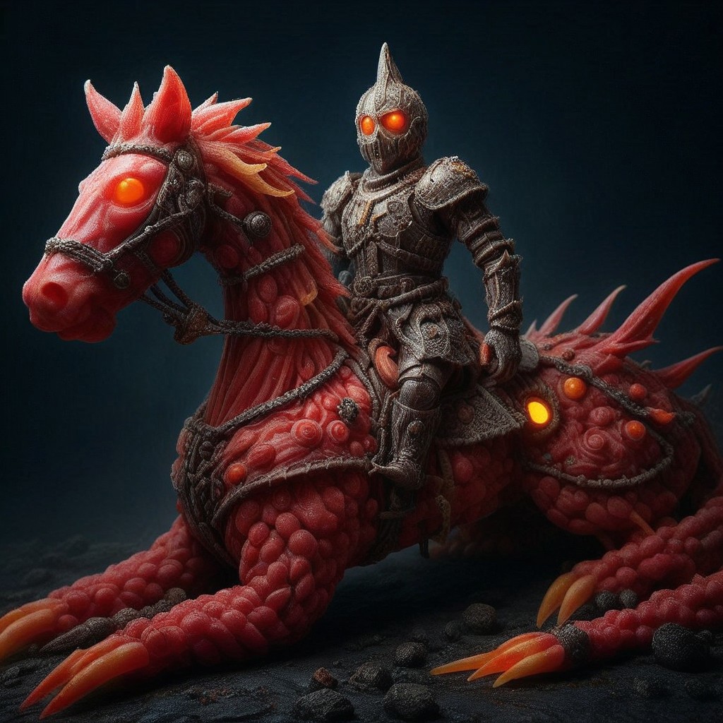candy, score_10 , score_9_up, score_8_up, score_7_up , score_6_up, a realistic armored knight made of candy is riding a mechanical horse, glowing eyes, candy armor, night background, moon, eerie atmosphere, gothic, grim dark, fantasy art, medieval, detailed armor, eerie glow, full armor, red glowing eyes, cape, rocky ground, fantasy creature, horror theme, fantasy setting, high contrast, detailed textures, ominous, realistic lighting, haunting, eerie glow, medieval fantasy, gothic style, detailed rendering, fantasy character, dark ambiance, eerie environment, fantasy creature, armored knight, glowing eyes, riding horse, knight over horse, realistic castle, castle background, smiling