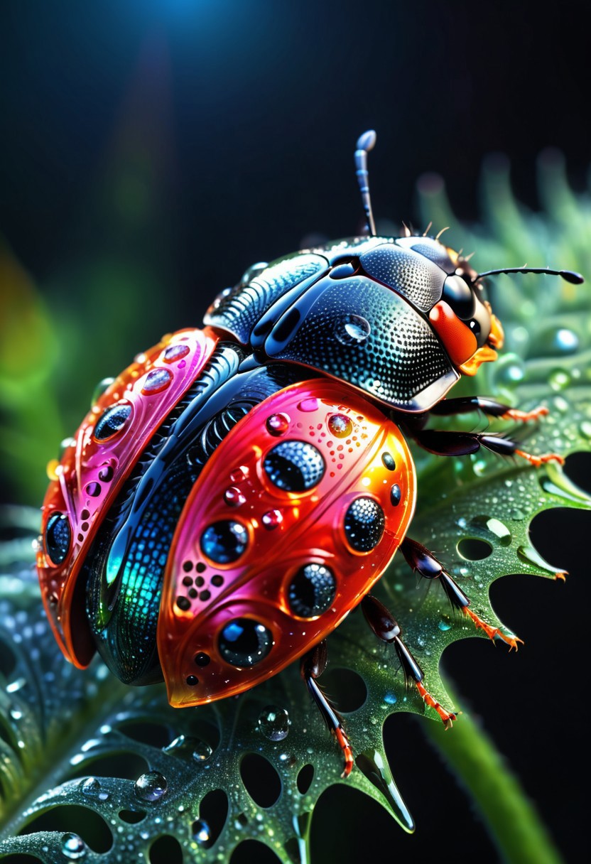 Fractangles, Macro Photography, a ladybug made out of fractangles, vibrant, shining starlight,dew drop, outdoor background, vibrant background, Extreme Detail, UHD,8K, natural Lighting, Professional Photography, fine art,