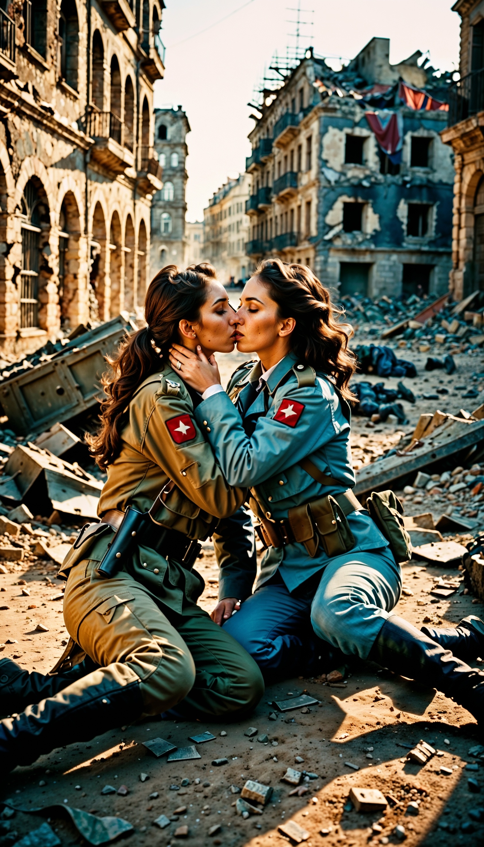 Ultrarealistic. sharp focus, dynamic lighting. play of light, high definition, Ultra detailed, high angle shot, realistic, war torn buildings, two females lovers, kissing. on the ground. Lay down on the ground. War and soldier fighting in background. Dirty clothes. Heartwarming scene