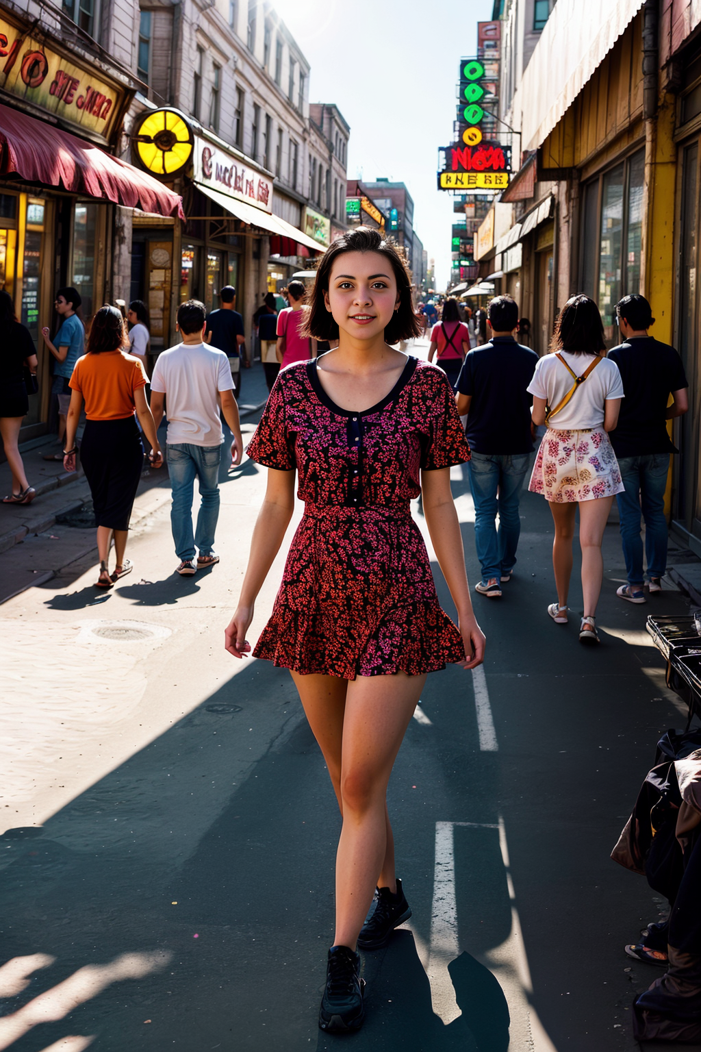 <lora:TinaTomaSD:1>, A young woman with in a modern casual dress, walking through a vibrant city street with street vendors, neon signs, and historic-modern buildings. Warm sunlight filters through, highlighting her composed demeanor. Cinematic composition, realistic lighting, and vibrant colors.