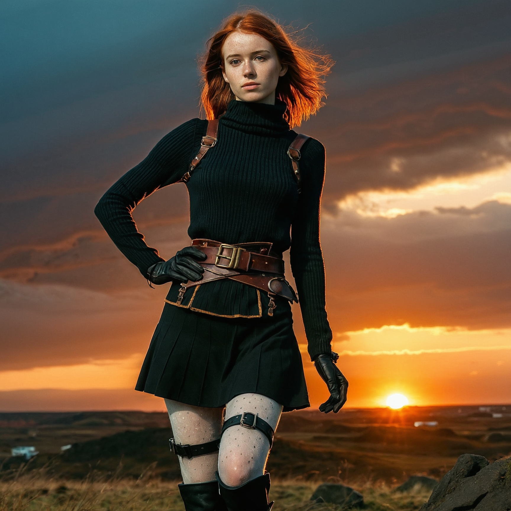 RAW full body analogue photo of a beautiful 20 years old woman, clear focus, 8K,__Random_Woman__,adasweater, black hair, short hair, black eyes, red sweater, turtleneck, harness, pantyhose, black gloves, belt ,photo Fantasy art combining the styles of Boris Vellejo and Luis Royo,Photorealistic, real photo, god rays, 1girl, 21yo,realistic, ,Sexy pose, erotic pose, exhibitionism ,steampunk clockwork city at sunset with warm hues and intricate mechanisms