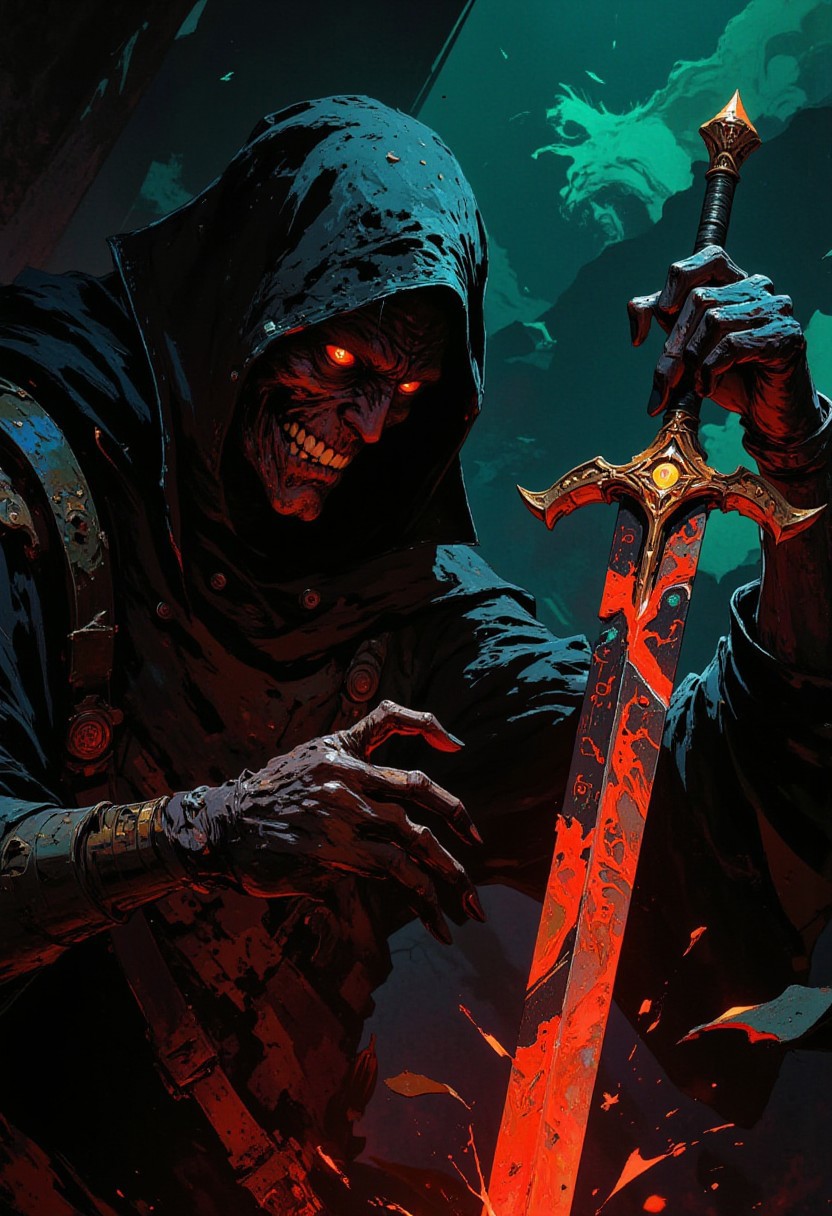 high quality, dynamic angle, unusual angle, dynamic, dynamic composition, single sword, runic engraving, runes, sould of the damned, broken sword, broken, damaged In the dim, flickering light, a sinister shadowy figure emerges, its presence cloaked in an air of mystery. (Looking at the viewer with sinister smile:1.3) Slowly, it reaches out toward the hilt of the shattered runic sword, its movements deliberate yet hesitant. The ancient engravings on the hilt begin to pulse faintly, glowing like a dying ember, their light casting eerie shadows across the figure’s outstretched hand. The closer it gets, the air grows colder, heavy with an otherworldly presence. From the jagged break in the blade, spectral wisps begin to unfurl, curling and twisting like smoke, their forms coalescing into ghostly faces etched with agony. Whispers fill the air—soft at first, but rising into a cacophony of tormented wails. The figure’s hand trembles as its fingers hover just above the hilt, as though sensing the weight of the cursed power it is about to claim. Finally, with a sharp intake of breath, the hand closes around the sword. The runes ignite with a blinding light, and the escaping souls recoil, writhing in both fear and fury <lora:FLUX\FLUX-daubrez-DB4RZ:0.3> <lora:FLUX\ArcaneFGTNR:0.5> <lora:FLUX\VividlySurrealApex:0.6> <lora:FLUX\Anime v1.3:0.5>