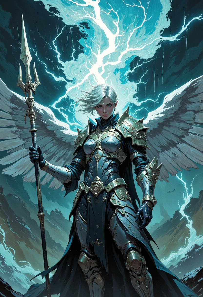 masterpiece, high-quality, photorealistic mythic warrior scene, An armored valkyrie. Her short, platinum hair drips with rain, plastered to her stern face as lightning etches the horizon in dazzling forks. Silver wings at her back bristle with brilliant, reflective plumage, each feather rendered in hyperdetailed clarity. A massive spear etched with runes stands upright at her side, buzzing with latent thunderous energy. The cinematic scale of the swirling tempest around her instills a breathless sense of epic grandeur and raw elemental power, <lora:FLUX\FLUX-daubrez-DB4RZ:0.3> <lora:FLUX\ArcaneFGTNR:0.5> <lora:FLUX\VividlySurrealApex:0.6> <lora:FLUX\Anime v1.3:0.5>