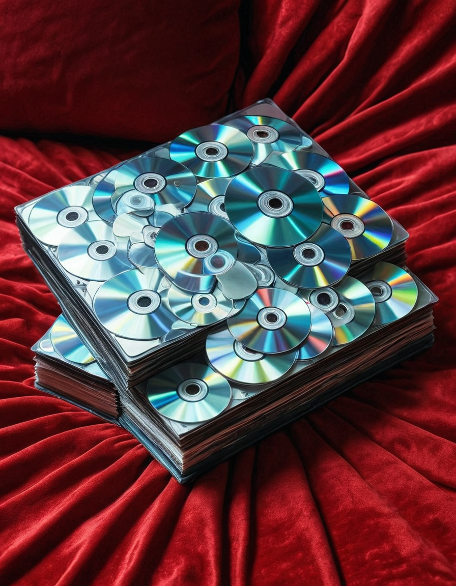 A book made of cd's , lying on a red velvet pillow <lora:CDs_SDXL:1>