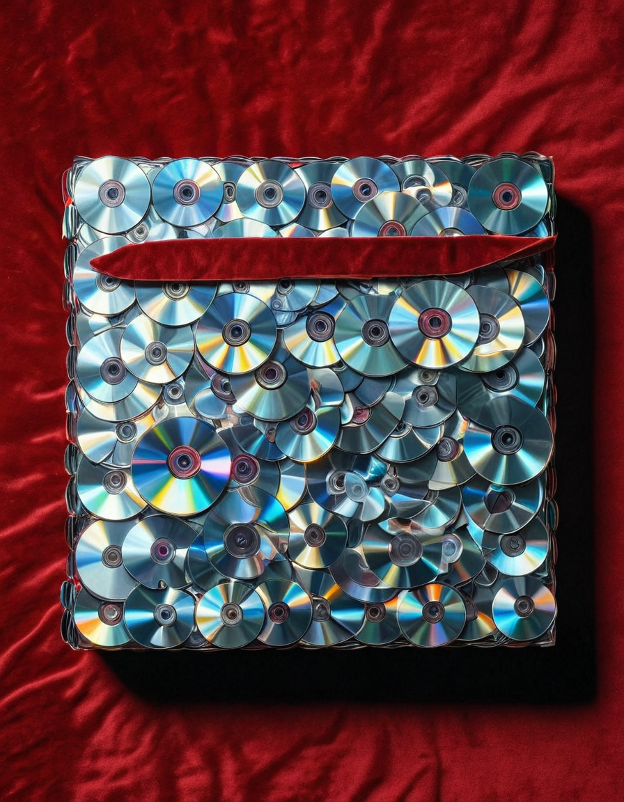 A book made of cd's , lying on a red velvet pillow <lora:CDs_SDXL:1>