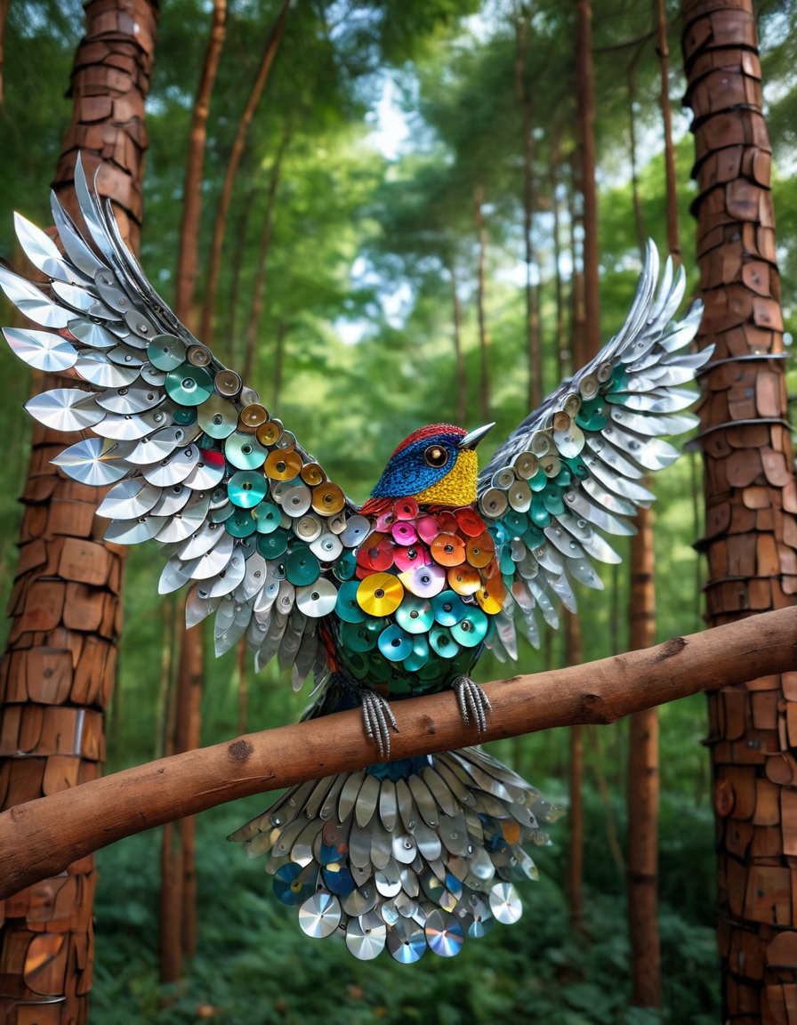 A bird in a forest made of cd's <lora:CDs_SDXL:1>
