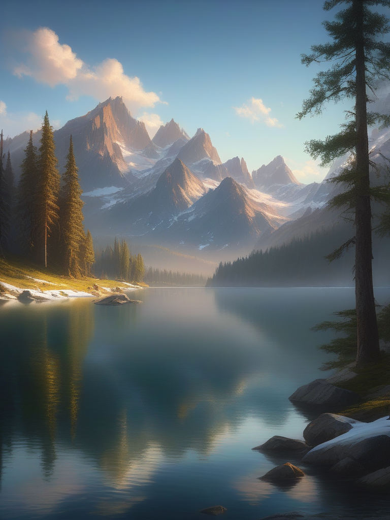<lora:06NatureArt_Hap_XL:1>, Albert Bierstadt style, Vibrant and dynamic illustrations and vectors, artstation trending, 4k resolution, Masterpiece,highly detailed, <lora:add-detail-xl:0.0001> ,<lora:hand 4:0.0001>, This artwork depicts a breathtaking alpine lake set against a backdrop of towering, snow-capped mountains. The crystal-clear water reflects the surrounding landscape, enhancing the sense of tranquility and purity. Tall pine trees frame the scene, with a few deer grazing along the shoreline, adding a touch of life to the pristine environment. The dramatic sky and the majestic mountains create a sense of awe and reverence for the natural world. â