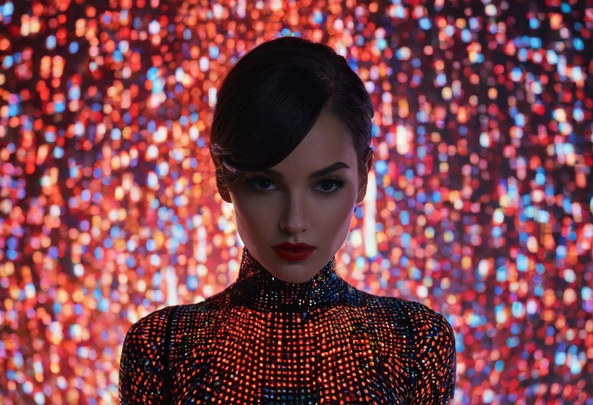 This is a high-resolution photograph of a woman with a striking, futuristic appearance. Her face and body are covered in a glowing, pixelated pattern of vibrant colors, including red, orange, yellow, green, blue, and white, which creates a mesmerizing, almost holographic effect. The colors are arranged in a complex, abstract design, with some areas of the pattern appearing more densely packed than others. Her skin is smooth and flawless, accentuated by the contrast of the glowing pixels. The woman has a slender build and is wearing a form-fitting, black bodysuit that mirrors the pixelated pattern, seamlessly blending with the light show. Her dark hair is pulled back into a sleek, low bun, and her eyes are strikingly blue, complemented by thick, dark eyelashes. She has full, red lips that stand out against the colorful background. The background is a dark, neutral color, which allows the glowing pixels to be the focal point. The lighting is soft but intense, casting shadows that enhance the depth and dimension of the image. The overall style of the photograph is modern and avant-garde, blending elements of technology and fashion into a visually stunning and thought-provoking composition.