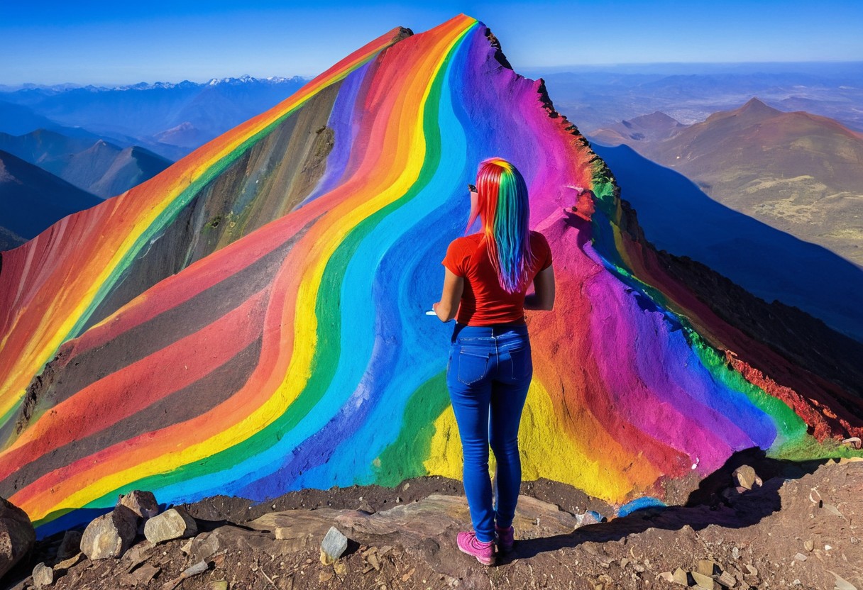 rainbow morph,1 female with rainbow-colored hair, standing on a mountainside, she is painting on a large paint board, creating a vivid and colorful rainbow that arches across the mountain landscape, the rainbow morphs into different hues and shapes, the art is fabulous, marvelous, and extraordinary, with intricate details and a sense of wonder, made out of rainbow