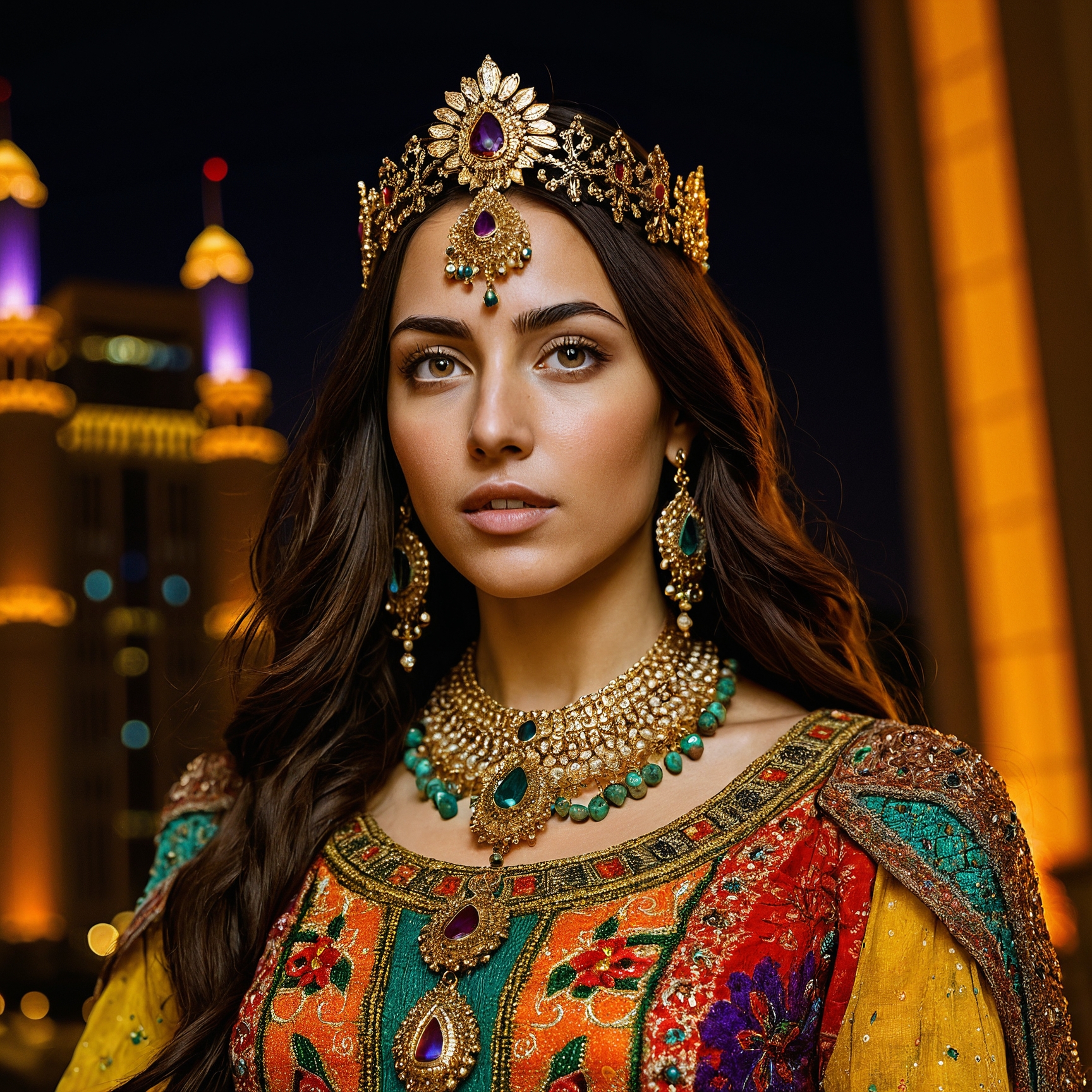 RAW full body analogue photo of a beautiful 20 years old woman, clear focus, 8K,__Random_Woman__,perfect face, sexy pose, wearing The Exotic Enchantress: A vibrant and colorful costume inspired by exotic cultures, featuring flowing fabrics, intricate beading, and statement jewelry, perfect eyes, detailed eyes, detailed iris, realistic skins absolute perfect tits, soft tits, natural tits ,low light, soft natural light, Rembrandt style light, Hasselblad DLSR camera, 200mm Zeiss lens, f/2.8 ,Sexy pose, erotic pose, exhibitionism ,The Burj Khalifa in Dubai with its towering height and modern design