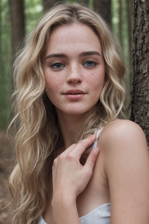 20yo female, long wavy blonde hair, pretty, freckles, POSING for viewer, hands, legs, detailed face, realistic skin, detailed skin, detailed skin pore, skin texture style, enthusiastic, super cute, influencer, Instagram, forest, running
