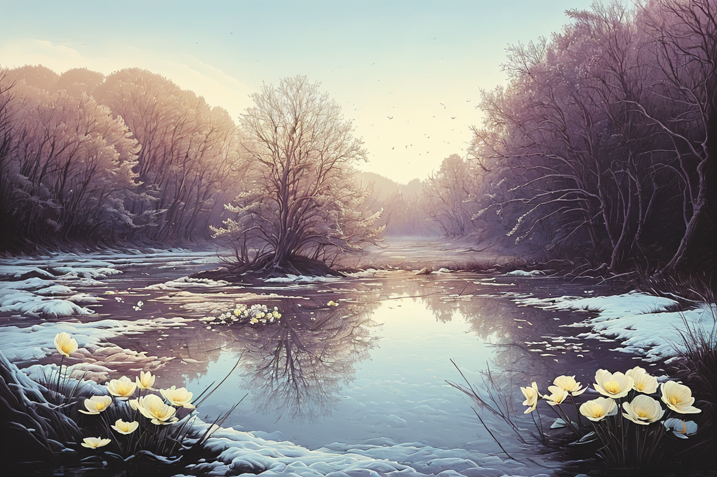 in tree,flock,reflective water, planet,fantasy,winter, reflection ,flower ,white flower , <lora:Ivan_Shishkin:0.4>, grass, field, forest, ivnshshkn, , gradient sky, <lora:dan_mumford:0.6>,